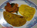 It is popularly known as Khatta is the accompaniment common for almost all regions. Made from sour butter-milk, it is mixed with chickpea flour and allowed to cooked with mustard seeds and crushed garlic cloves. The taste depends on the time it is allowed to stay on fire.